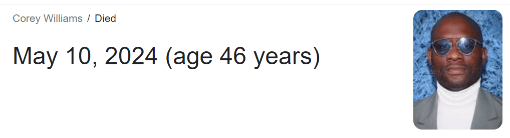 May 14, 2024May 18, 2024 Corey “Homicide” Williams dead at 46. Dead at age 46 Dies 86 days from his birthday Died May 10th GIVE KNOWLEDGE AND SHARE THIS! Click to share on Facebook (Opens in new window) Facebook Click to share on Telegram (Opens in new window) Telegram Click to share on X (Opens in new window) X Like Loading... Related