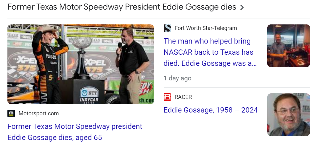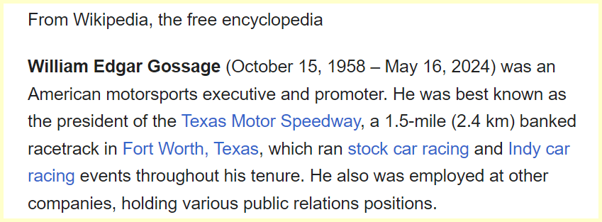 May 18, 2024May 18, 2024 Eddie Gossage, who served as president of Texas Motor Speedway has died at age 65 Died on 65 date numerology at age 65 Died 152 days before his birthday or a span of 153 GIVE KNOWLEDGE AND SHARE THIS! Click to share on Facebook (Opens in new window) Facebook Click to share on Telegram (Opens in new window) Telegram Click to share on X (Opens in new window) X Like Loading... Related