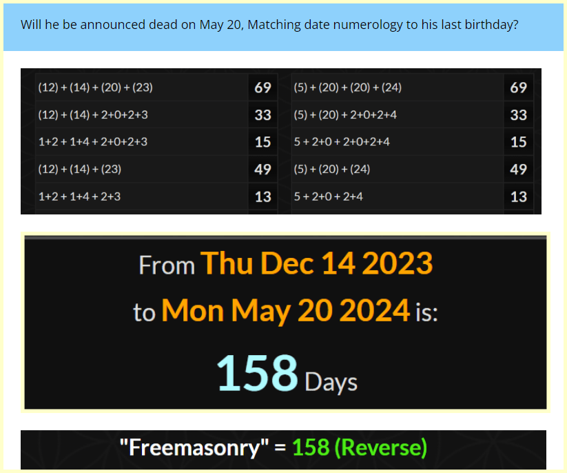 My prediction yesterday comes true. He is announced dead on matching date numerology with his last birthday. This is what I said yesterday and also commented in Zach’s LIVE stream on 5/19/24
