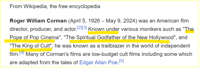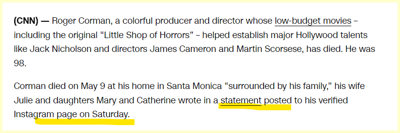 May 24, 2024 Roger Corman, the low-budget movie king behind ‘Little Shop of Horrors,’ dies at 98 His death makes headlines on May 11th, which is 127 days from the film release. GIVE KNOWLEDGE AND SHARE THIS! Click to share on Facebook (Opens in new window) Facebook Click to share on Telegram (Opens in new window) Telegram Click to share on X (Opens in new window) X Like Loading... Related