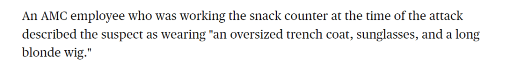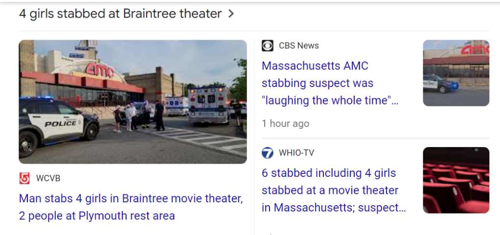 The stabbing occurs at Braintree AMC Movie Theater on the 146th day of the year.