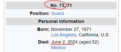 He died on the 154th day of the year after wearing number 73 and drafted on the day leaving 251 days left.