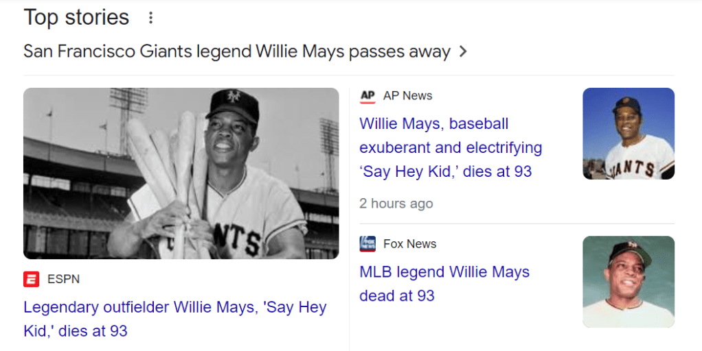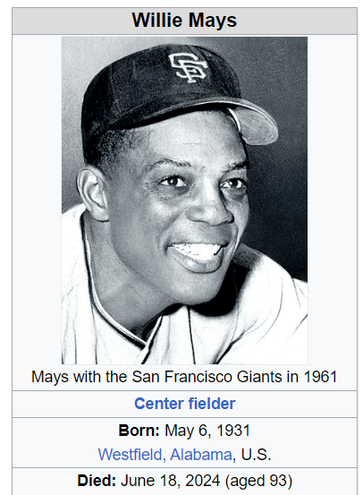 June 19, 2024June 19, 2024 Legendary outfielder Willie Mays, ‘Say Hey Kid,’ dies at 93 Dead 43/44 days from his birthday Dead 25 days from his debuts Dead 83 days from his last appearance anniversary in 73 GIVE KNOWLEDGE AND SHARE THIS! Click to share on Facebook (Opens in new window) Facebook Click to share on Telegram (Opens in new window) Telegram Click to share on X (Opens in new window) X Like Loading... Related