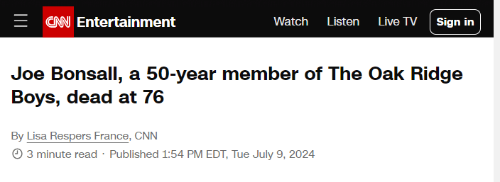 July 13, 2024 Joe Bonsall, a 50-year member of The Oak Ridge Boys, dead at 76. Headlines on 7/9 46 years after his debut 56 days from the anniversary of the debut album GIVE KNOWLEDGE AND SHARE THIS! Click to share on Facebook (Opens in new window) Facebook Click to share on Telegram (Opens in new window) Telegram Click to share on X (Opens in new window) X Like Loading... Related