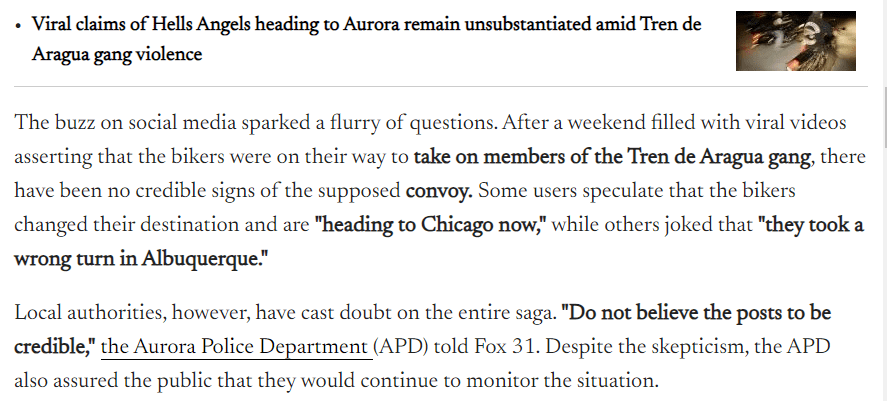 September 4, 2024 What happened to the Hells Angels supposedly heading to Aurora? Familiar number patterns. 144/177 See previous post below Venezuelan gang activity confirmed by Aurora officials after release of Colorado woman’s surveillance video goes viral, August 30th headlines. GIVE KNOWLEDGE AND SHARE THIS! Click to share on Facebook (Opens in new window) Facebook Click to share on Telegram (Opens in new window) Telegram Click to share on X (Opens in new window) X Like Loading... Related