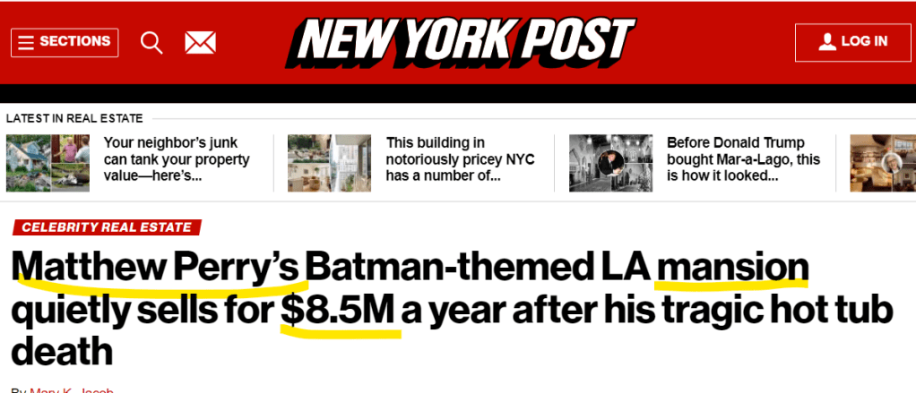 November 1, 2024 Matthew Perry’s mansion sells for 8.5 million. Mockery GIVE KNOWLEDGE AND SHARE THIS! Click to share on Facebook (Opens in new window) Facebook Click to share on Telegram (Opens in new window) Telegram Click to share on X (Opens in new window) X Like Loading... Related