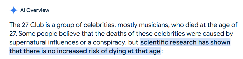 Notice, A I highlights the words that debunk the theory when searching for the 27 club.
