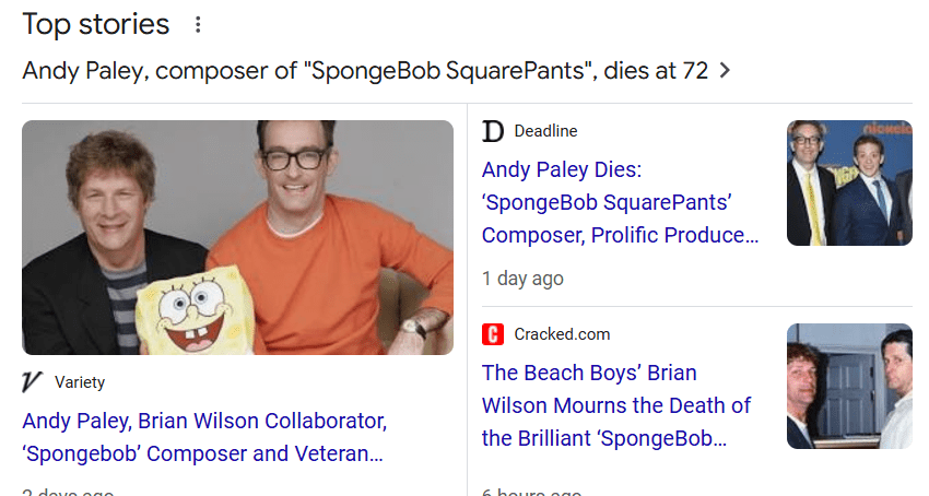 November 23, 2024 Andy Paley ‘SpongeBob SquarePants’ Composer Dies, aged 72 GIVE KNOWLEDGE AND SHARE THIS! Click to share on Facebook (Opens in new window) Facebook Click to share on Telegram (Opens in new window) Telegram Click to share on X (Opens in new window) X Like Loading... Related