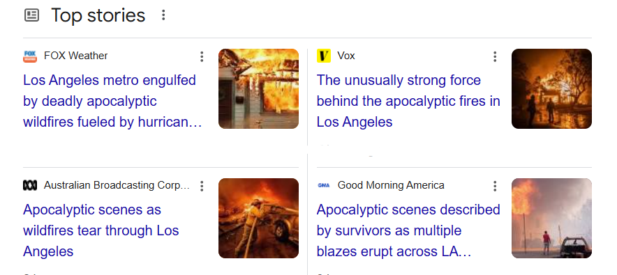 January 9, 2025January 11, 2025 Los Angeles metro engulfed by deadly apocalyptic wildfires fueled by hurricane-force wind gusts Jan. 7th 2025 Cali burns from Apocalyptic WINDS on 7/1 Jan. 7th Maui burned on 8/8. Revelation 7:1 and Revelation 8:8 GIVE KNOWLEDGE AND SHARE THIS! Click to share on Facebook (Opens in new window) Facebook Click to share on Telegram (Opens in new window) Telegram Click to share on X (Opens in new window) X Like Loading... Related