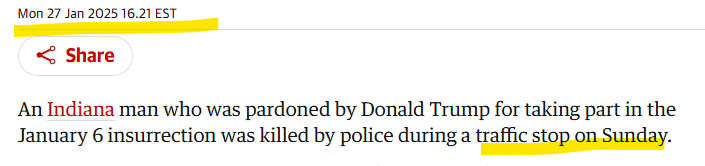 January 27, 2025January 27, 2025 Man Pardoned from Jan 6th is shot and killed by police in Jasper County Indiana. The perfect script for Indiana and a traffic stop shooting. GIVE KNOWLEDGE AND SHARE THIS! Click to share on Facebook (Opens in new window) Facebook Click to share on Telegram (Opens in new window) Telegram Click to share on X (Opens in new window) X Like Loading... Related