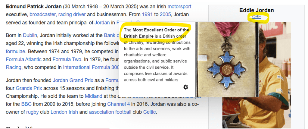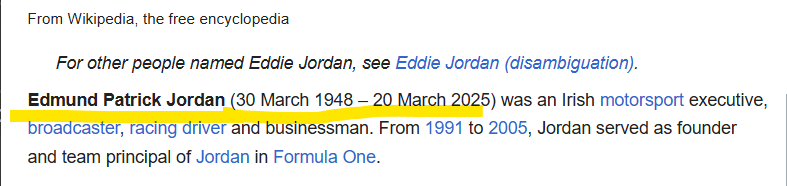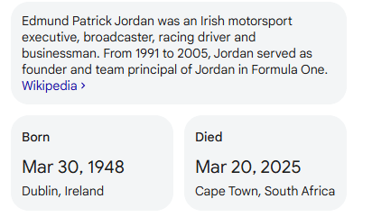 March 22, 2025 Eddie Jordan, former F1 team owner who gave Michael Schumacher his debut, dies aged 76 He died at age 76 and 76 days after Michael Schumacher’s Birthday. It’s A big Club. GIVE KNOWLEDGE AND SHARE THIS! Click to share on Facebook (Opens in new window) Facebook Click to share on Telegram (Opens in new window) Telegram Click to share on X (Opens in new window) X Like Loading... Related