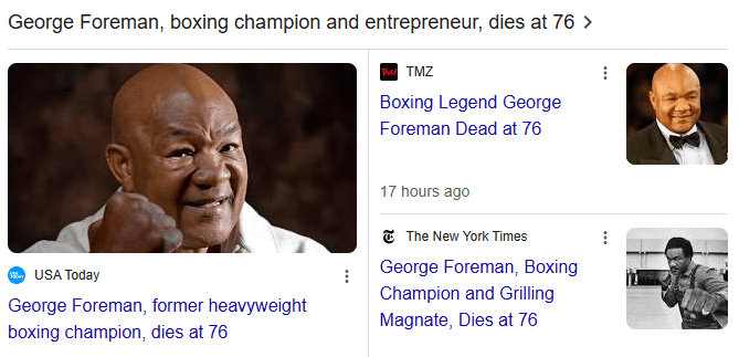 George Forman is reported dead by main stream headlines on 3/22. He died yesterday on 3/21 at age 76, We know 76 is a big number with black history.