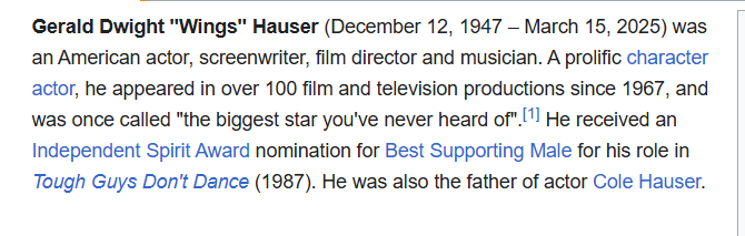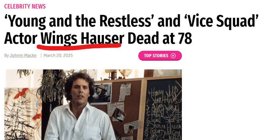 March 22, 2025 Vice Squad’ Actor Wings Hauser Dead at 78 Dead on 15/3 He died 43 years and 52 days after the release date of Vice Squad. He also died on the 74th day of the year. GIVE KNOWLEDGE AND SHARE THIS! Click to share on Facebook (Opens in new window) Facebook Click to share on Telegram (Opens in new window) Telegram Click to share on X (Opens in new window) X Like Loading... Related