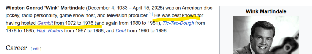 He was best known for having hosted Gambit from 1972. He died 52 years and 224 days after the release.