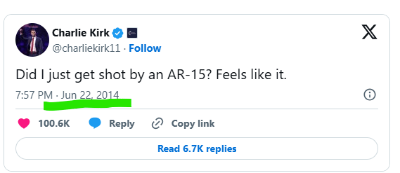 September 15, 2025September 15, 2025 Charlie Kirks eerie post from 6/22/2014 GIVE KNOWLEDGE AND SHARE THIS! Click to share on Facebook (Opens in new window) Facebook Click to share on Telegram (Opens in new window) Telegram Click to share on X (Opens in new window) X Like Loading... Related