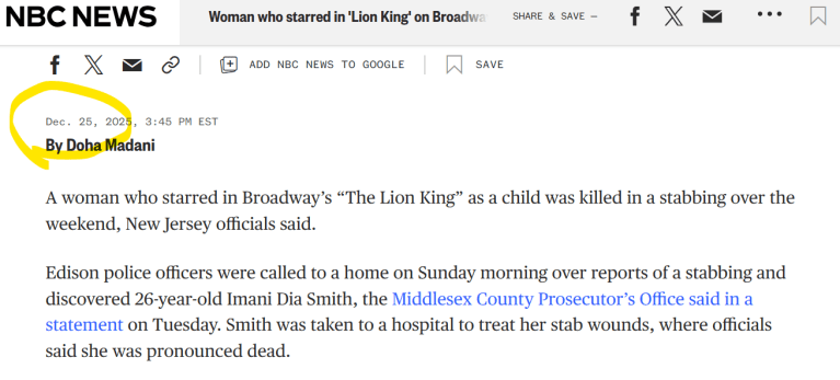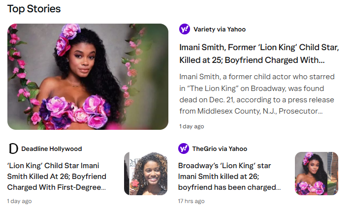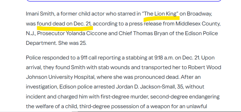 Imani Smith, Former ‘Lion King’ Broadway Actress, Dies in Alleged Homicide at 26 or maybe 25. The headlines report 2 different ages.