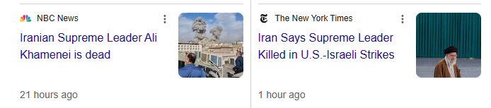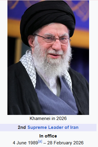 March 1, 2026 Ali Hosseini Khamenei, supreme leader of Iran from 1989 Killed 96 days from his anniversary of taking office. GIVE KNOWLEDGE AND SHARE THIS! Share on Facebook (Opens in new window) Facebook Share on Telegram (Opens in new window) Telegram Share on X (Opens in new window) X Like Loading... Related
