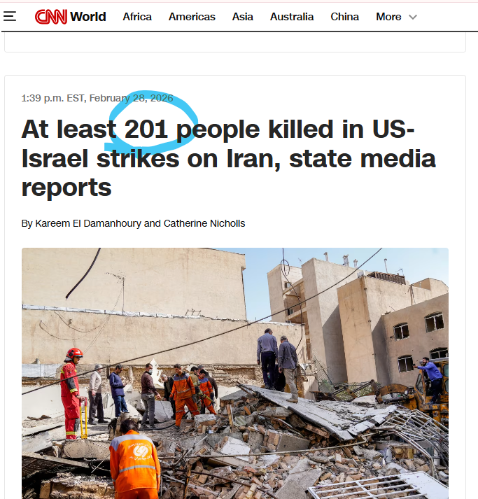 March 1, 2026 At least 201 people killed in US-Israel strikes on Iran, state media reports. O how they love 201 :) Those that know, know. GIVE KNOWLEDGE AND SHARE THIS! Share on Facebook (Opens in new window) Facebook Share on Telegram (Opens in new window) Telegram Share on X (Opens in new window) X Like Loading... Related