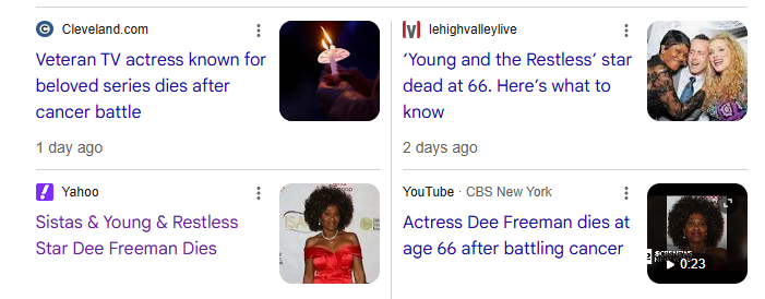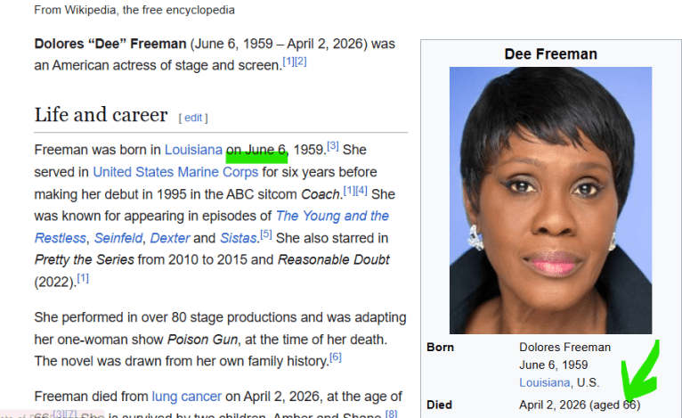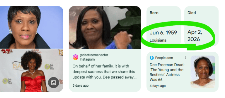 April 8, 2026 4/2 never fails with the deaths of Black celebrities. Dee Freeman, Actress Known for The Young and the Restless and Sistas, Dies at 66 Born 6/6 dead at 66 and 66 days from her birthday. GIVE KNOWLEDGE AND SHARE THIS! Share on Facebook (Opens in new window) Facebook Share on Telegram (Opens in new window) Telegram Share on X (Opens in new window) X Like Loading... Related