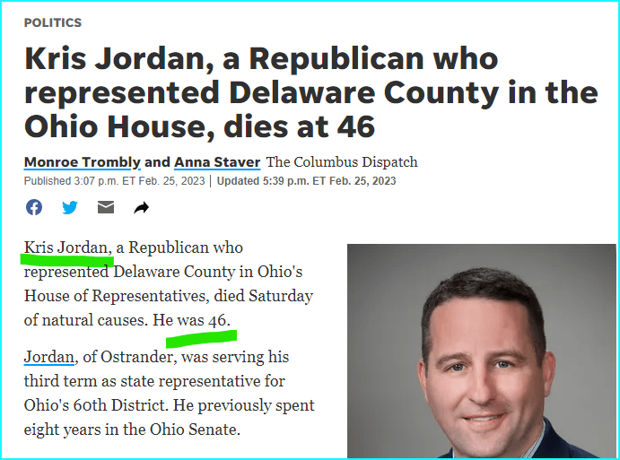 Kris Jordan, a Republican who represented Delaware County in the Ohio House, dies at 46.